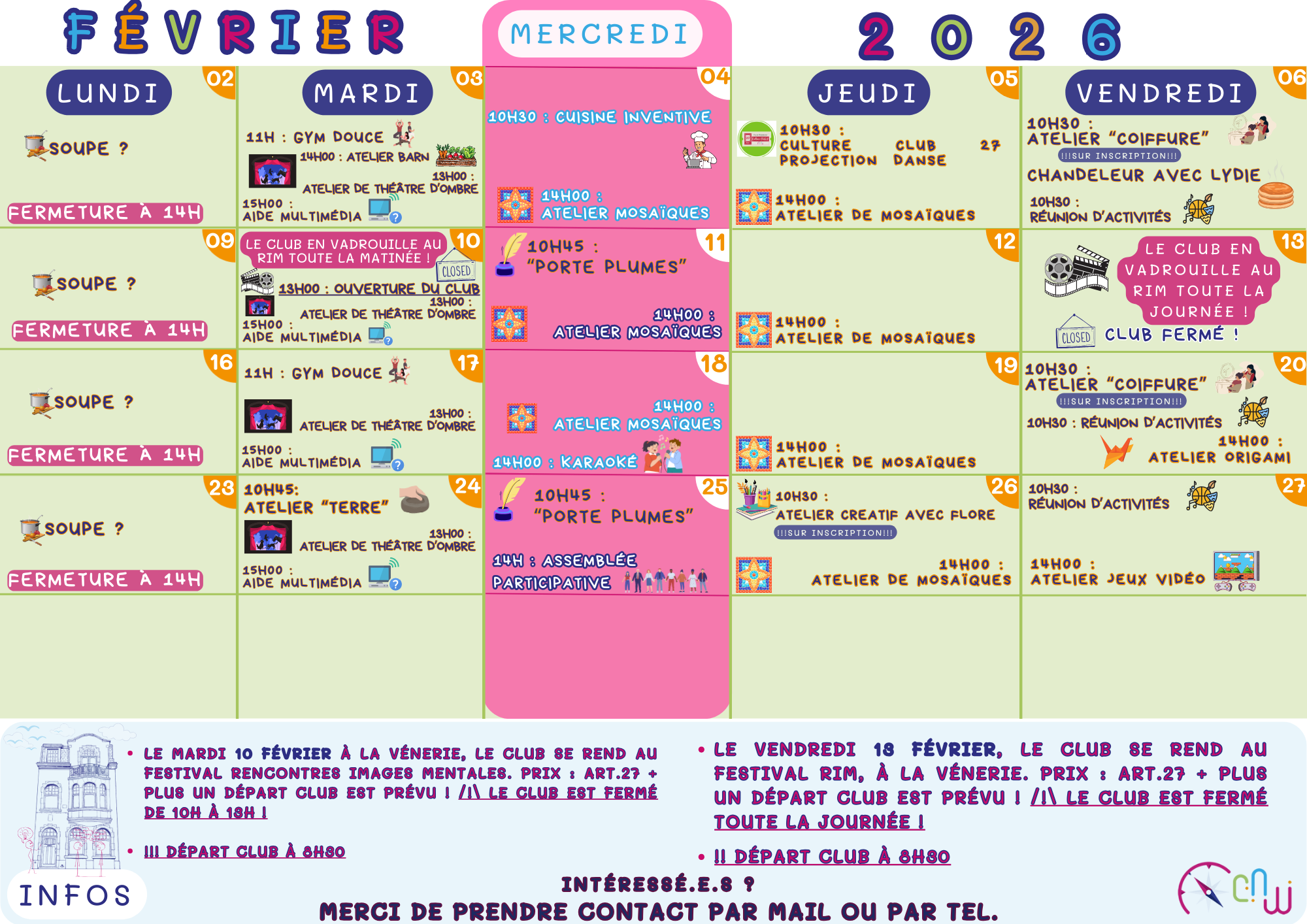 Une phrase qui revient souvent concernant les activités potentielles est “rien n’est obligatoire, tout est possible”. Les activités au Club sont généralement organisées par ou avec les membres. L’idée phare du Club concernant les activités et ateliers réside dans le fait que chacun est détenteur d’un savoir, chacun a quelque chose à partager. Certaines activités sont mises en place en partenariat avec des structures partenaires, au sein du Club ou à l’extérieur.