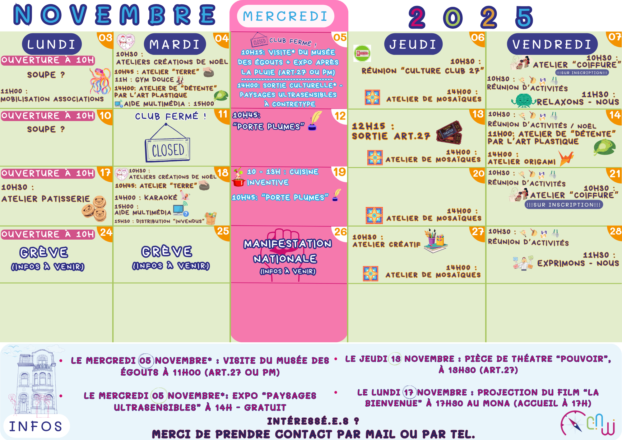 Een zin die vaak terugkomt met betrekking tot mogelijke activiteiten is "niets is verplicht, alles is mogelijk". De activiteiten in het Club worden meestal georganiseerd door of met de leden. Het kernidee van het Club met betrekking tot activiteiten en workshops is dat iedereen een bepaalde kennis heeft, iedereen heeft iets om te delen. Sommige activiteiten worden opgezet in samenwerking met partnerorganisaties, zowel binnen het Club als daarbuiten.